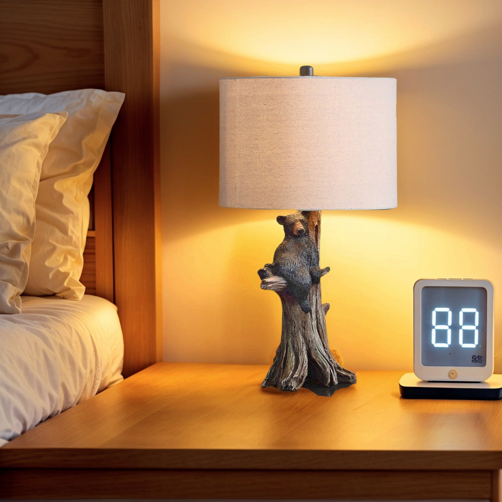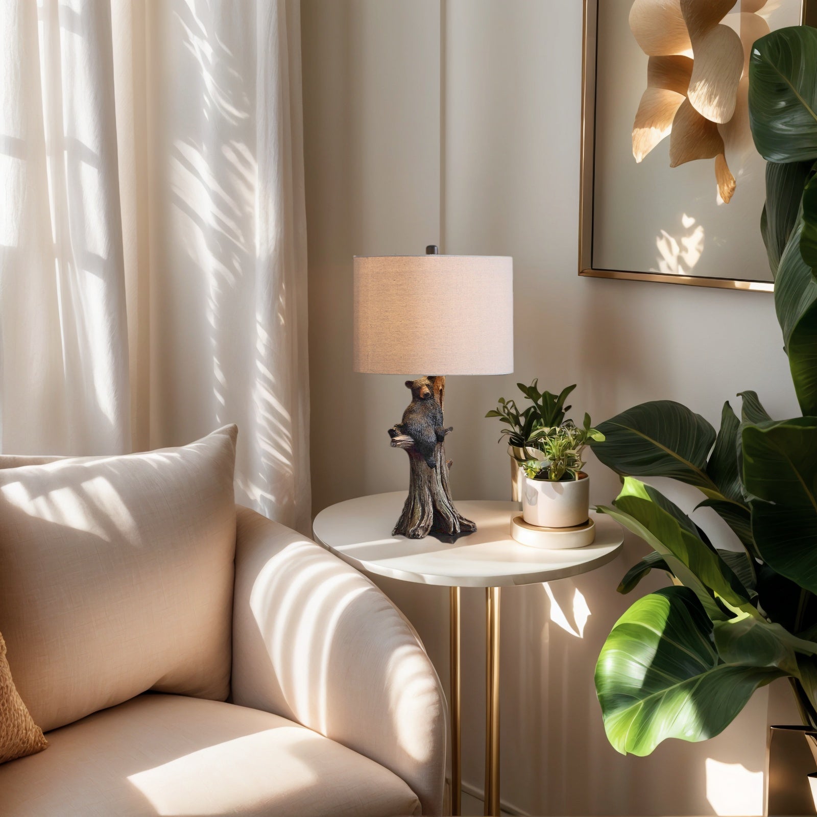 Inspired by the outdoor lifestyle, this table lamp showcases a charming black bear figurine resting against a realistic brown tree trunk base, bringing a touch of rustic warmth to your home.