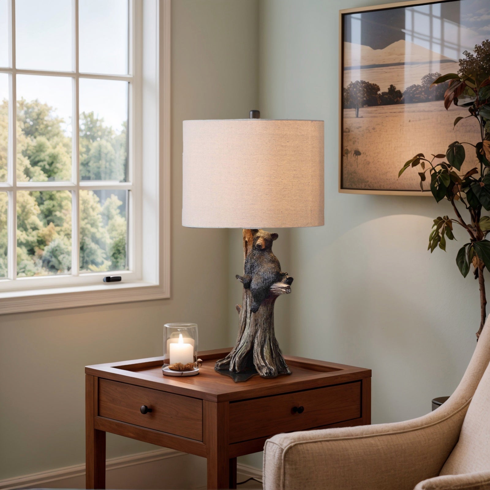 Fortune Candy 24.75" Rustic Black Bear Table Lamp, Polyresin Tree Trunk Base with Fabric Drum Shade for Home Decor