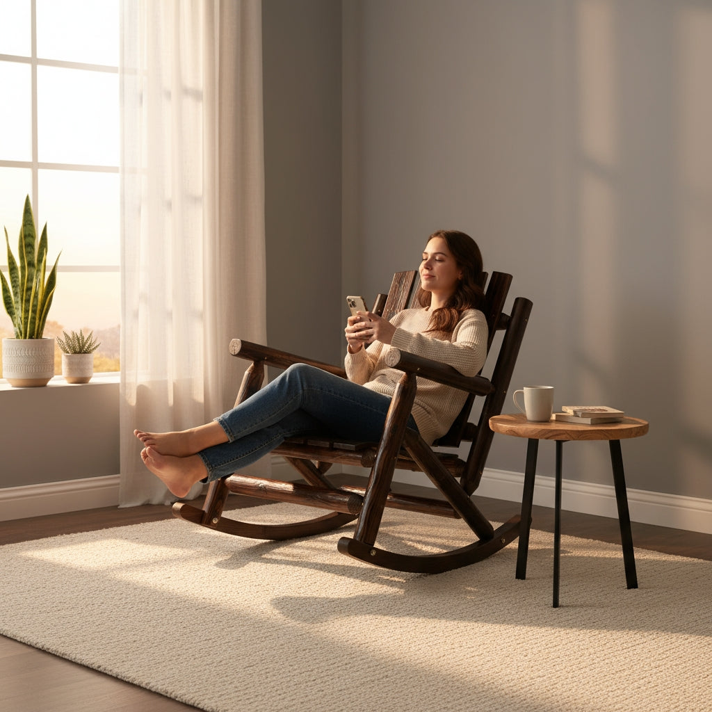 Fortune Candy 32.4 in. Rustic Log Handcrafted Solid Fir Wood, 1 Person, 700 lb Capacity, Slat Back Outdoor Rocking Chair, Brown