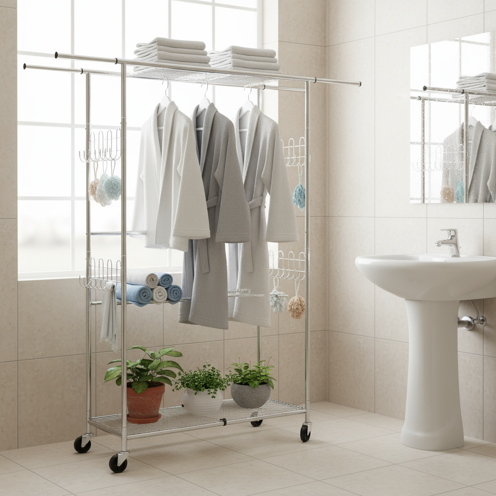 <br>Smooth-Rolling & Lockable Wheels: Equipped with four 360° swivel casters that glide effortlessly across floors; lockable wheels ensure the rack stays securely in place when needed.
