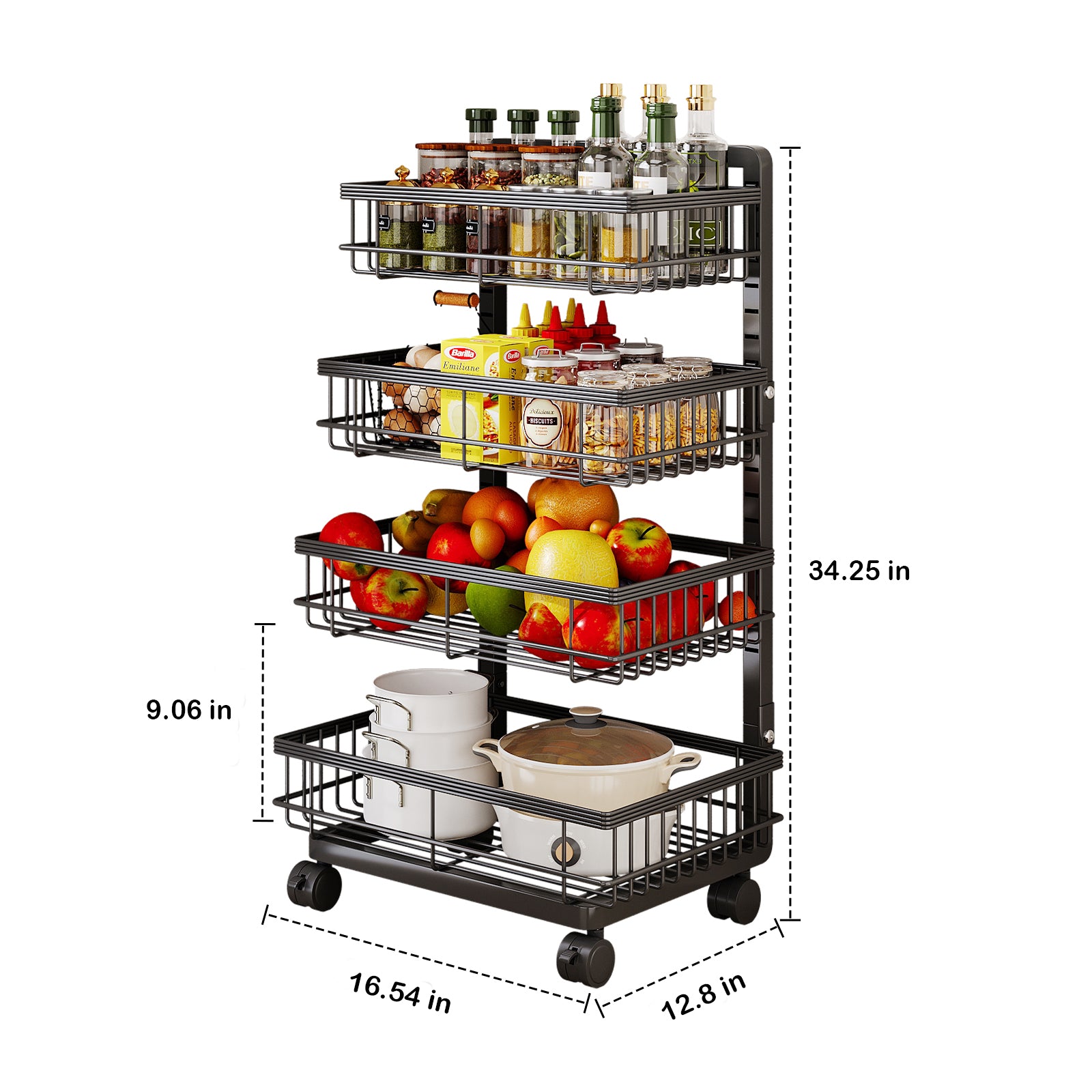 <br>This 4-tier cart provides ample space to organize kitchen essentials, snacks, or pantry items.