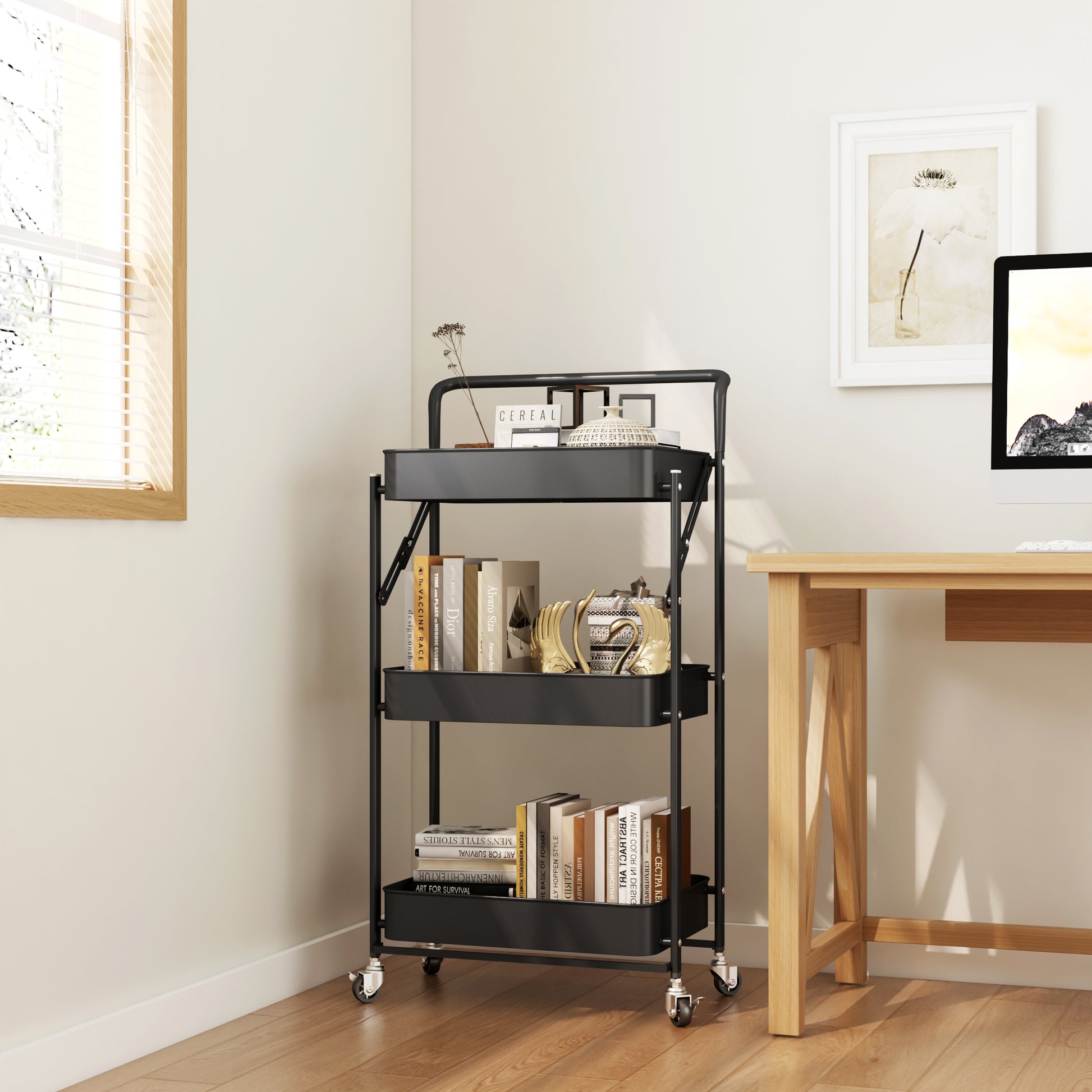 Fortune Candy Foldable 3-Tier Rolling Utility Cart, No-Assembly Multipurpose Storage Organizer with Handle for Home or Office, Black