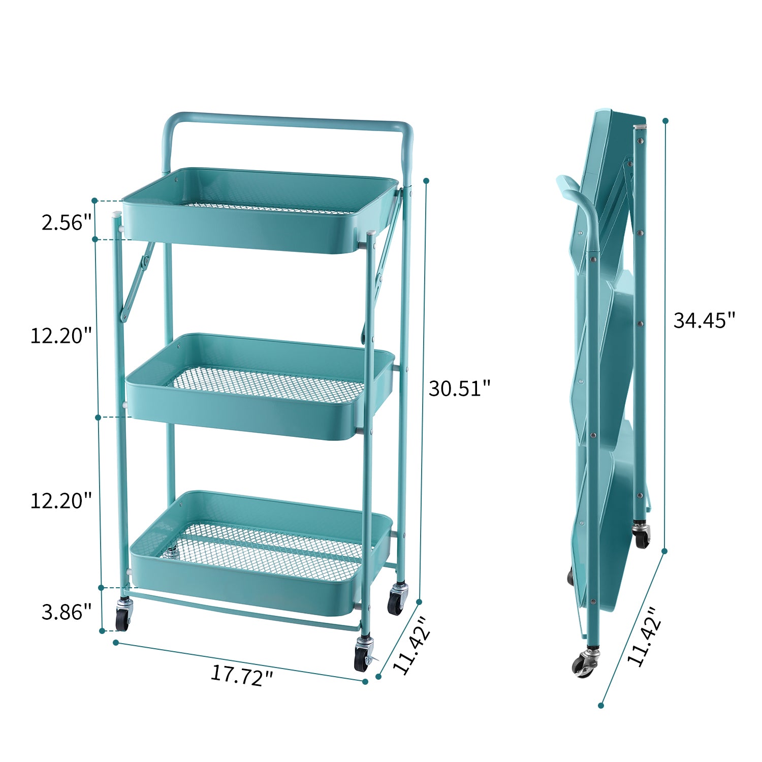 Fortune Candy Foldable 3-Tier Rolling Utility Cart, No-Assembly Multipurpose Storage Organizer with Handle for Home or Office, Green