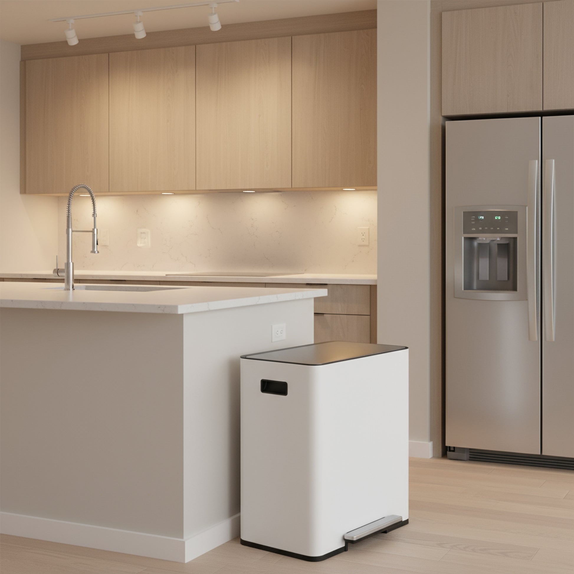 This stainless steel recycling trash can features two 8 gallon compartments, allowing you to sort trash and recyclables or separate different types of recyclables in one bin. Each compartment includes a removable plastic bucket that can be used with or without trash bags. The step-on design provides hands free operation, and the lid closes quietly and slowly. The durable foot pedal is built for long term use and responds to pressure from any angle.