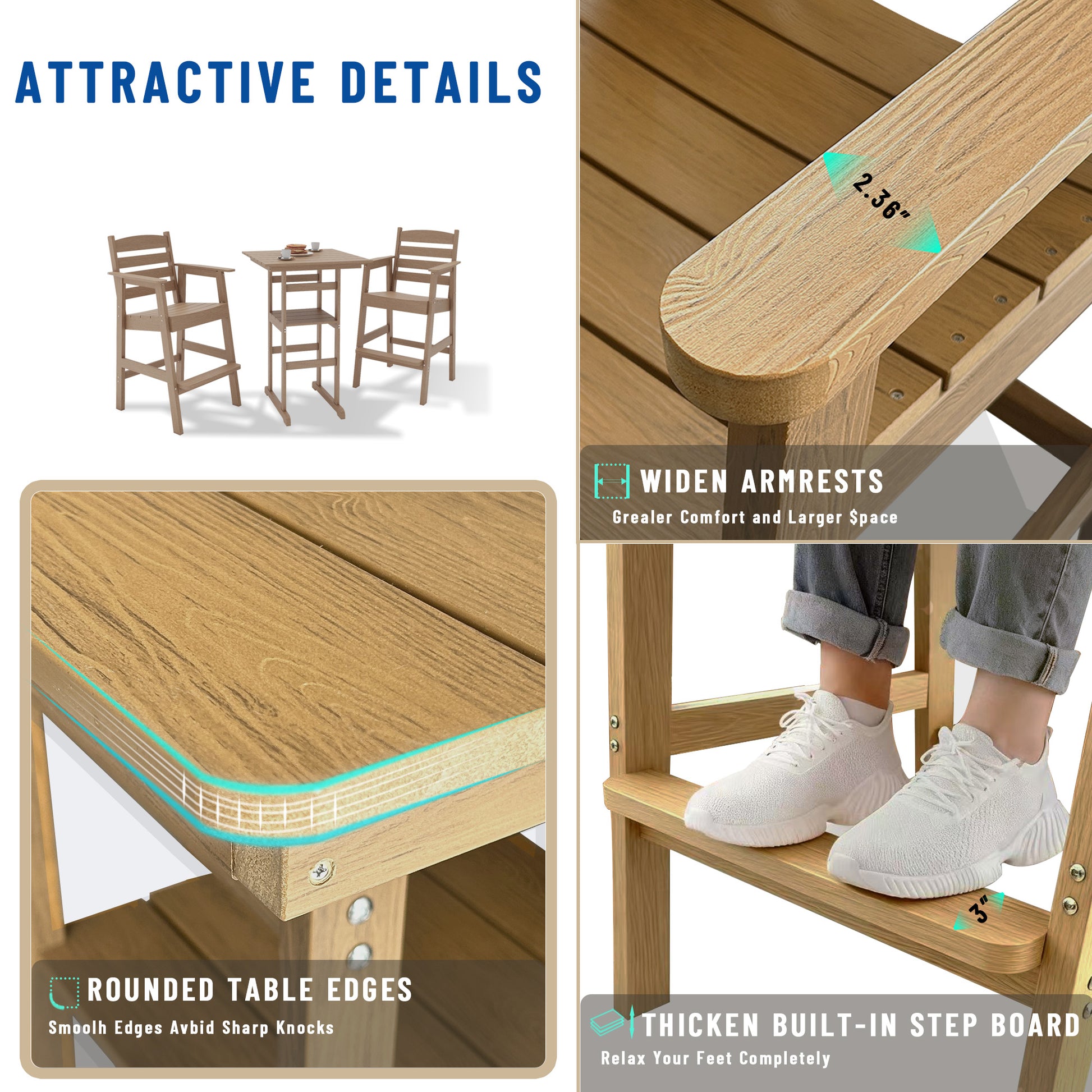 This outdoor bar table set is designed for durability, style, and convenience.